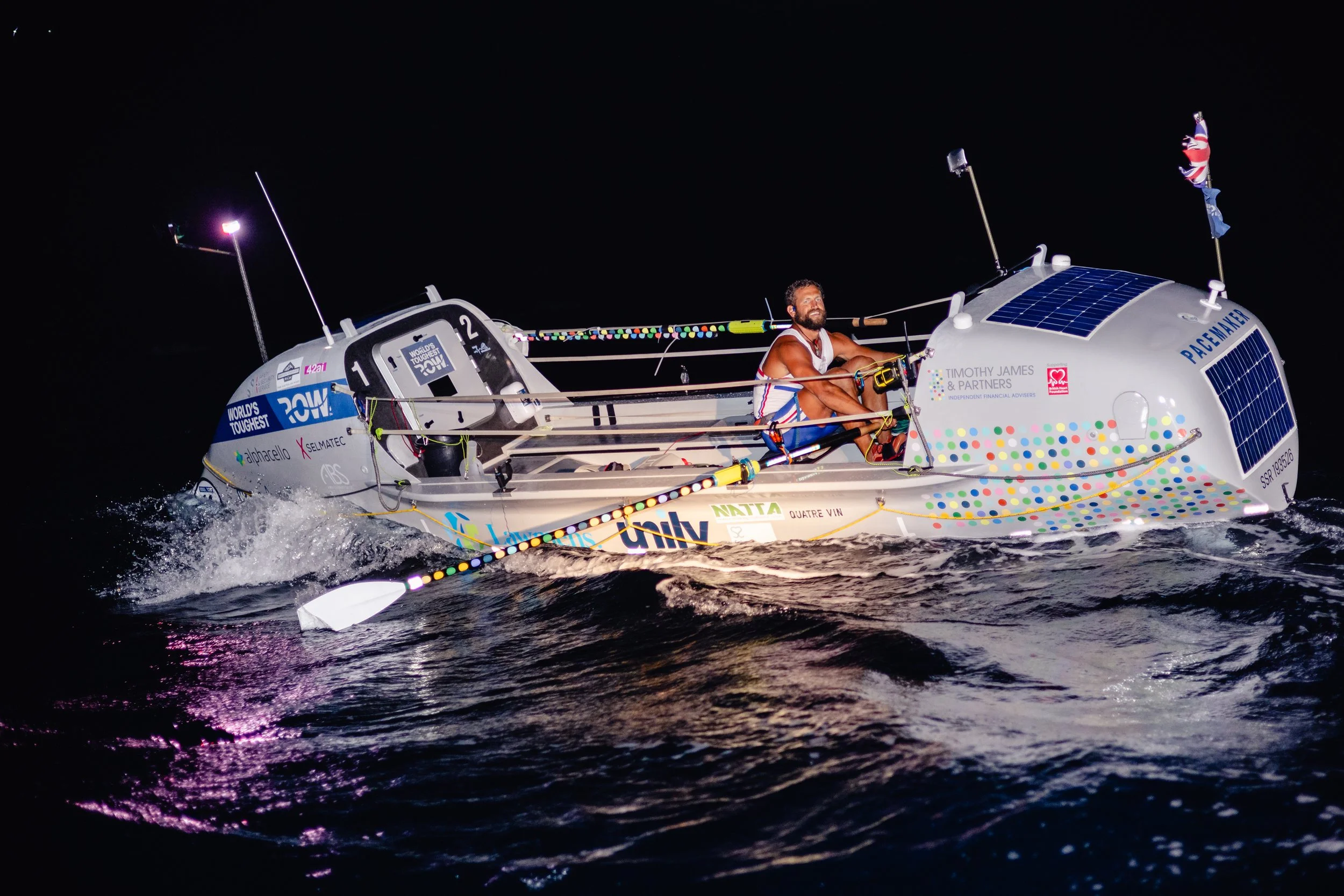 Photo of Elliot at the finish of Pacemakers first row across the Atlantic Ocean in 2023